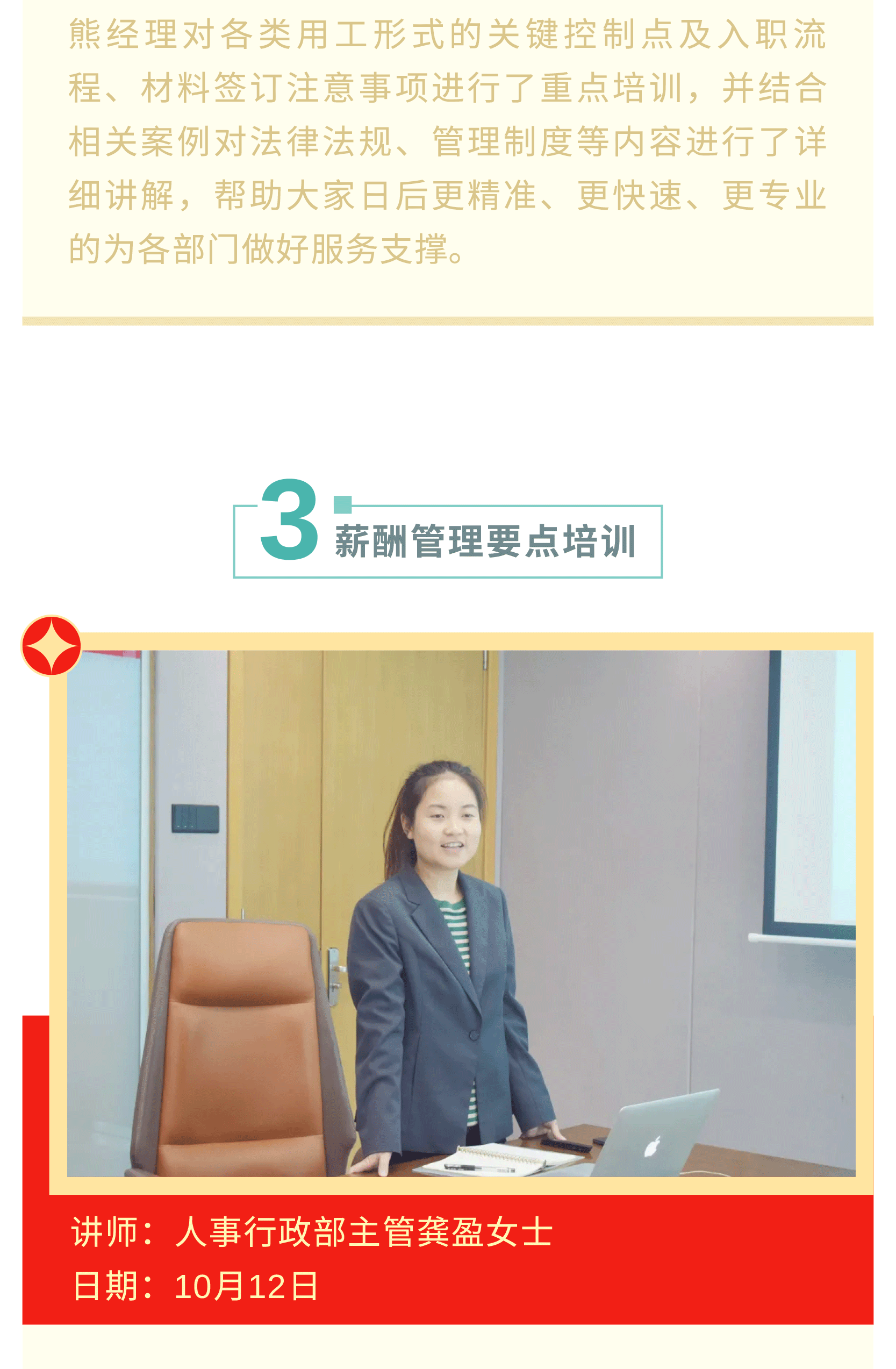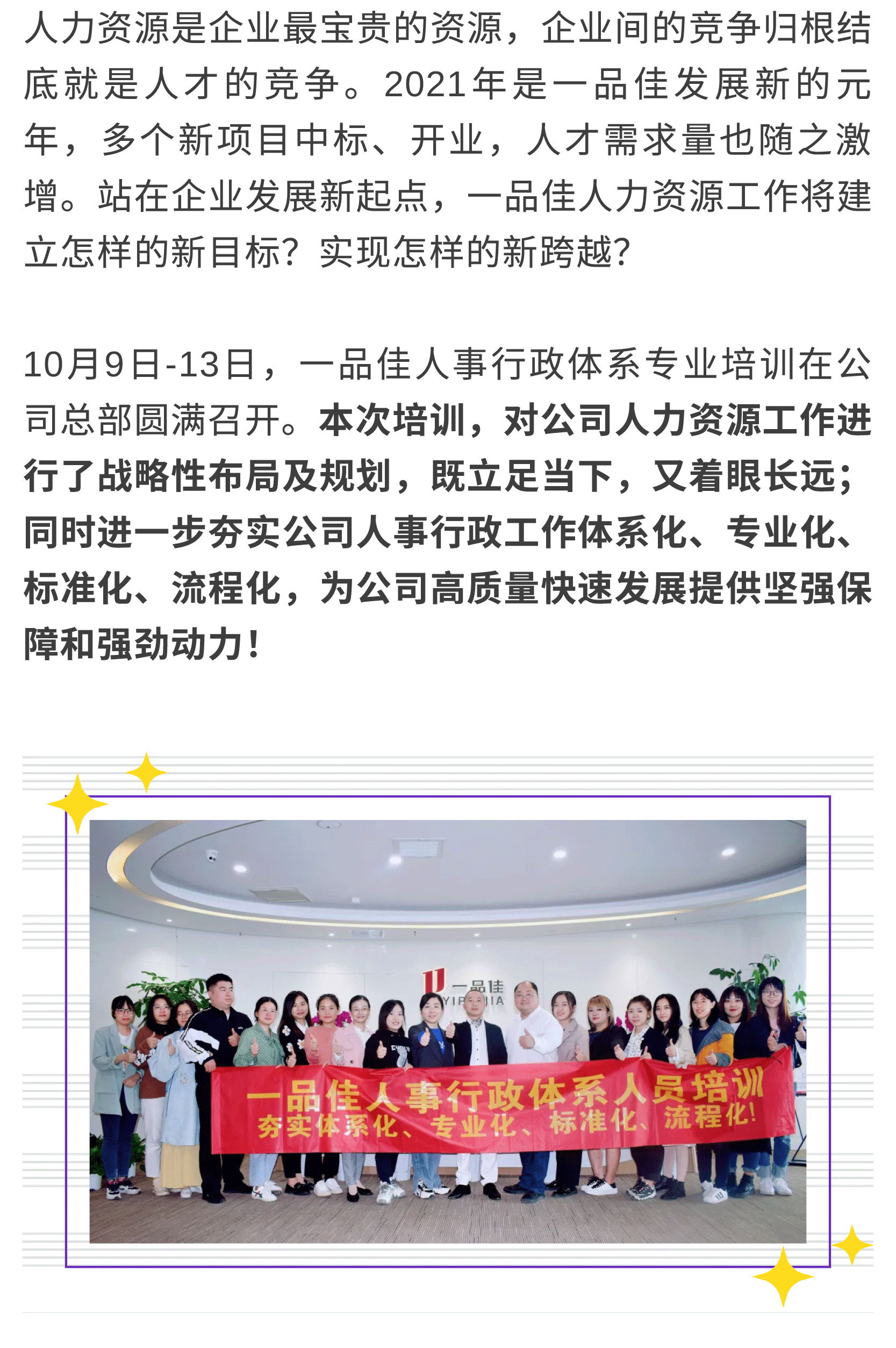 对公司人力资源工作进行了战略性布局及规划,同时进一步夯实公司人事行政工作体系化、专业化、标准化、流程化,为公司高质量快速发展提供坚强保障和强劲动力!