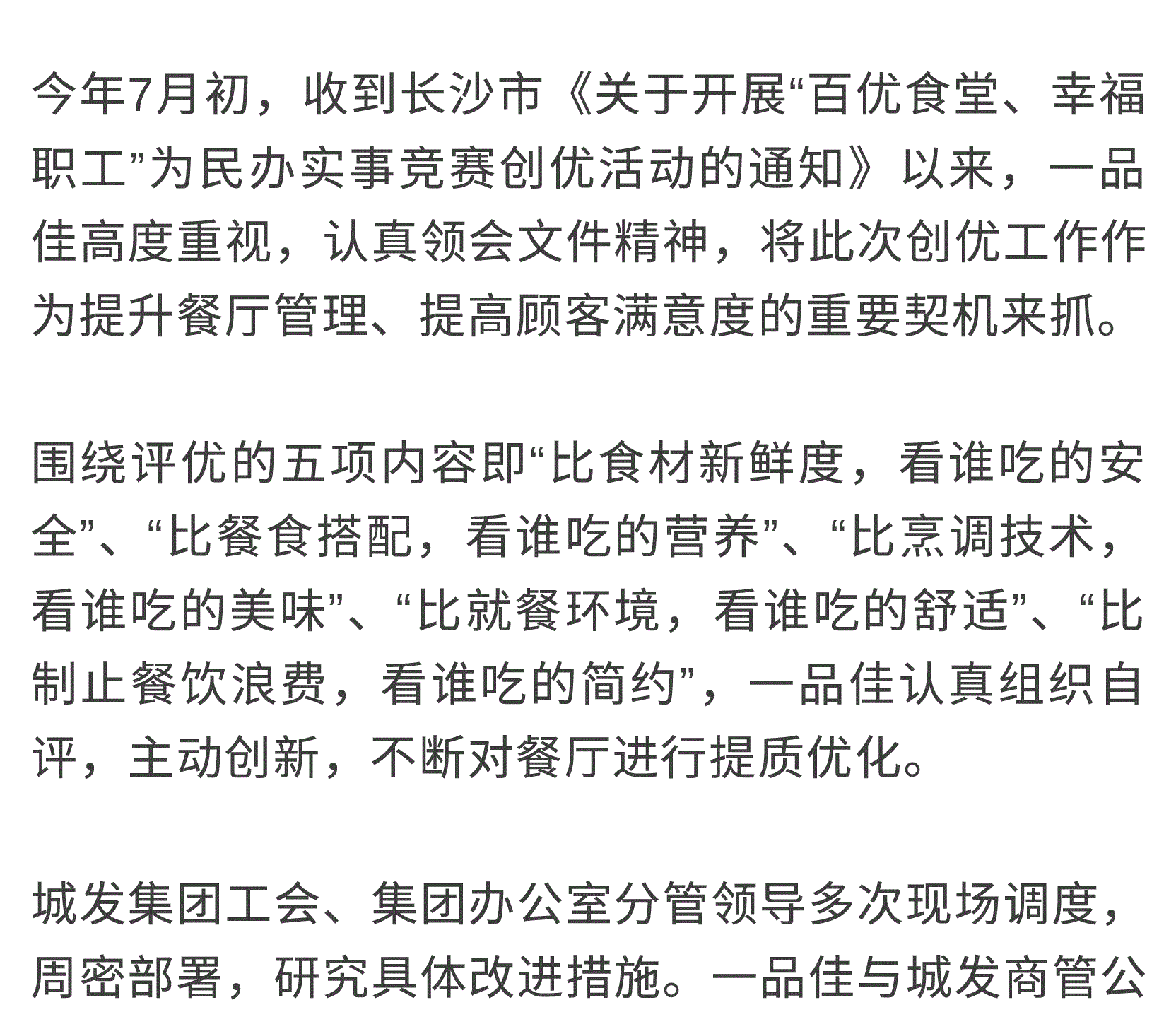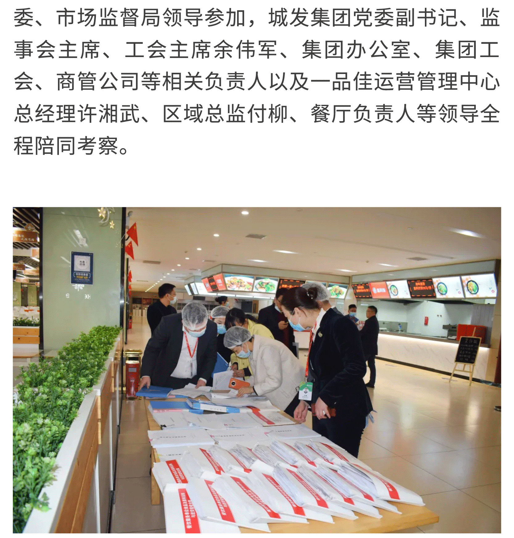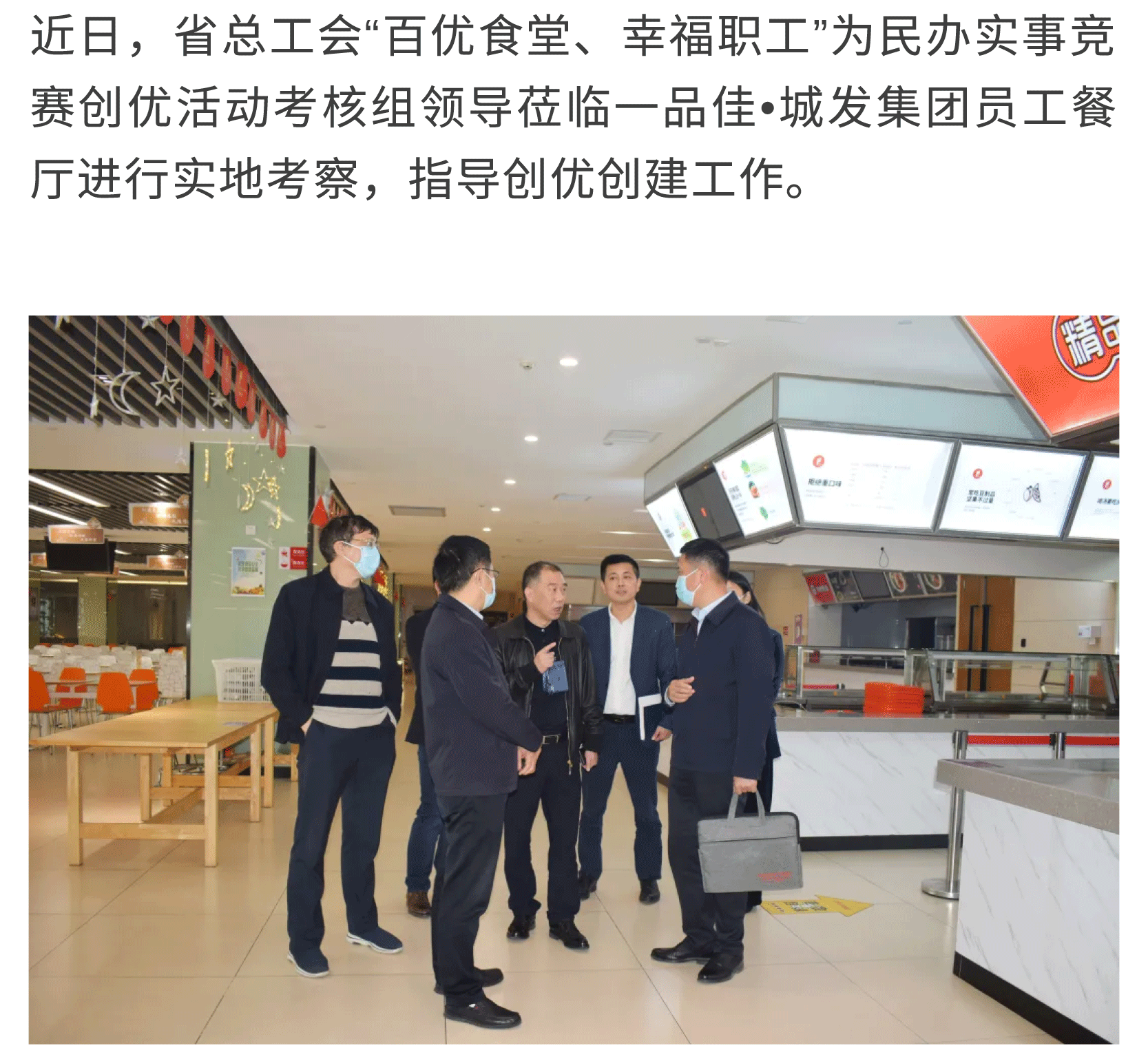 近日,省总工会“百优食堂、幸福职工”为民办实事竞赛创优活动考核组领导莅临一品佳•城发集团员工餐厅进行实地考察,指导创优创建工作。