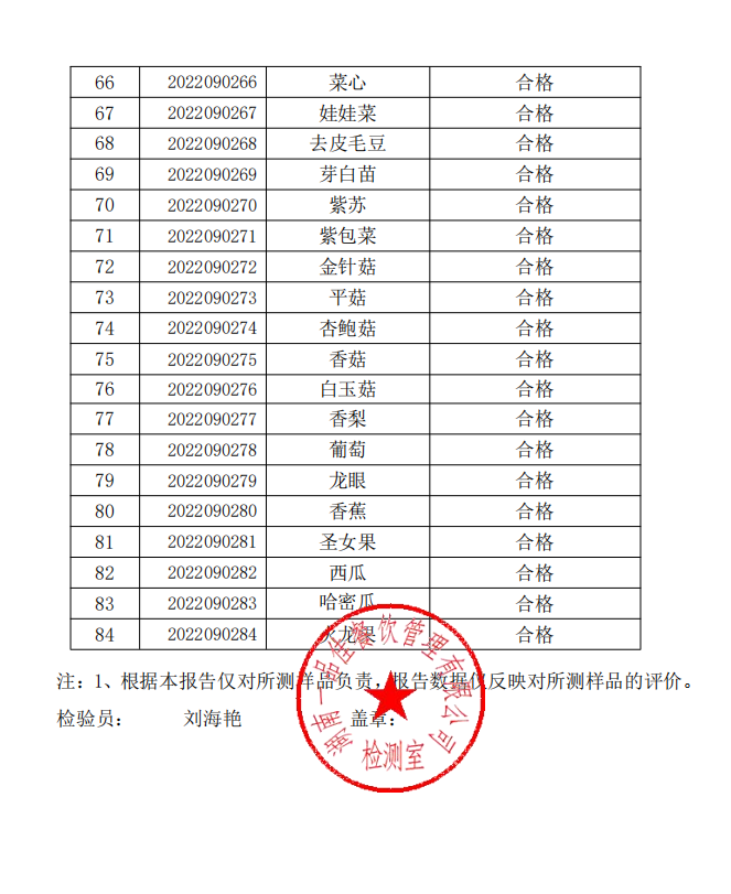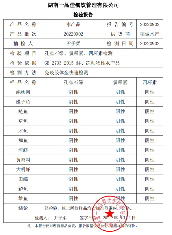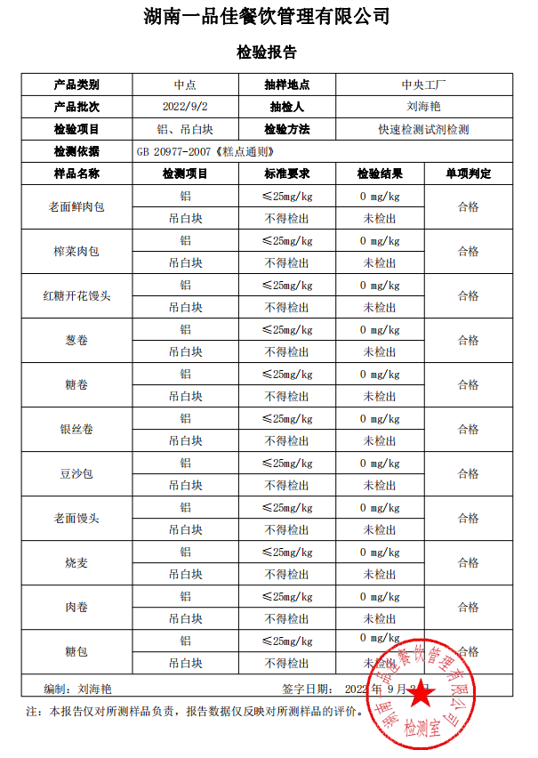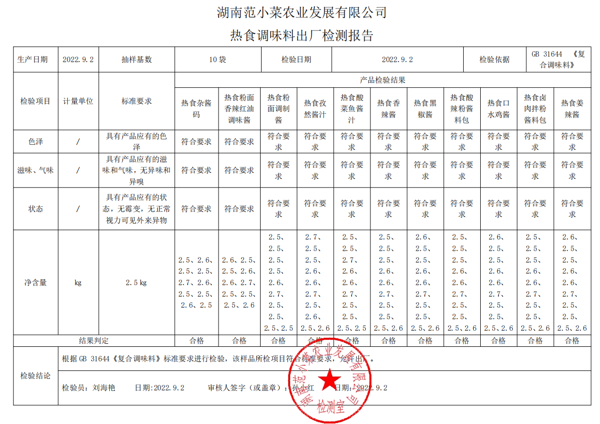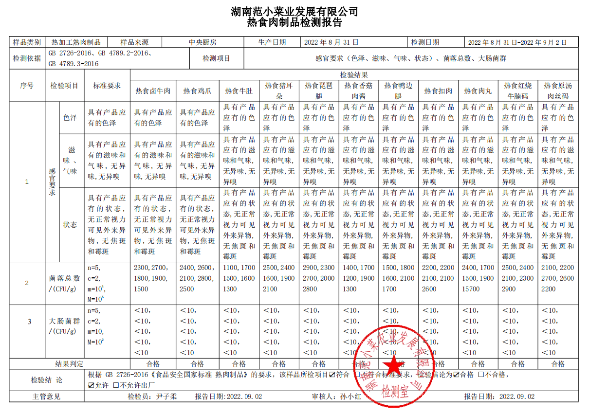 范小菜热食肉制品、热食调味料、一品佳中点、水产、农残检测报告