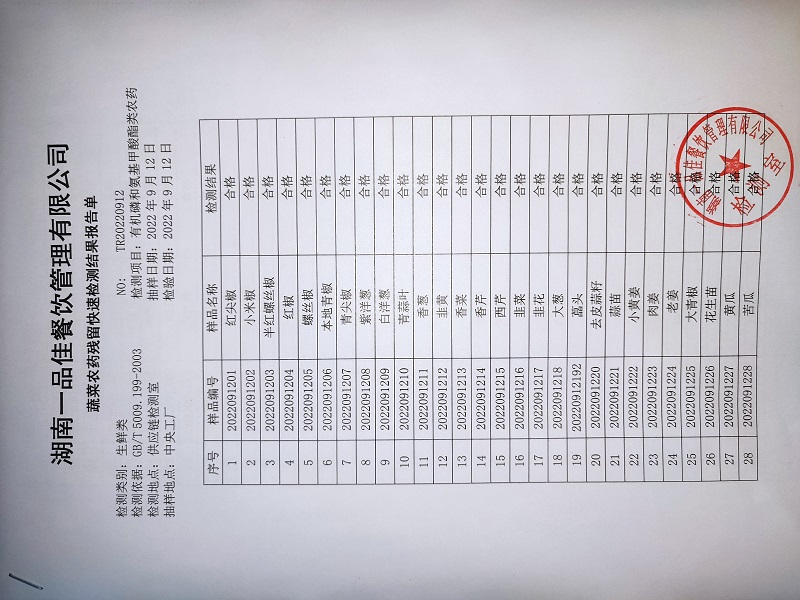 范小菜热食肉制品、热食调味料、意面、一品佳中点、水产、农残检测报告2022.9.12
